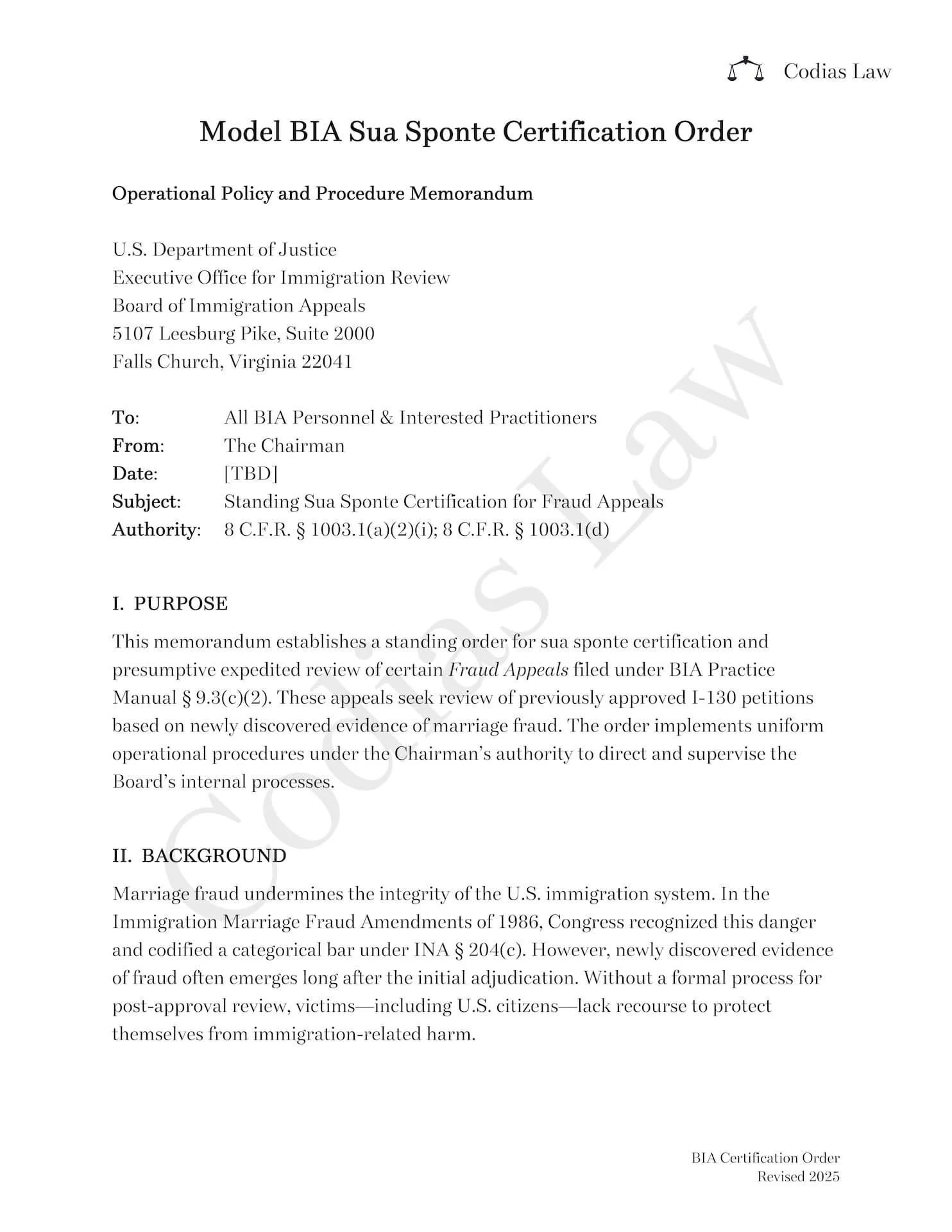 In this enforcement vacuum, the Board stands as one of the last institutional safeguards for victims and the immigration system. As detailed in our June 25, 2025 testimony before Congress (available at www.codiaslaw.com/bia-fraud-appeals), the national marriage fraud crisis demands urgent corrective action. Under 8 C.F.R. § 1003.1(b)(5), the BIA already has appellate jurisdiction over DHS decisions, including both approvals and denials. What’s missing is not authority — but formal procedures that empower victims to challenge fraudulent I-130 approvals without relying on a dysfunctional USCIS.