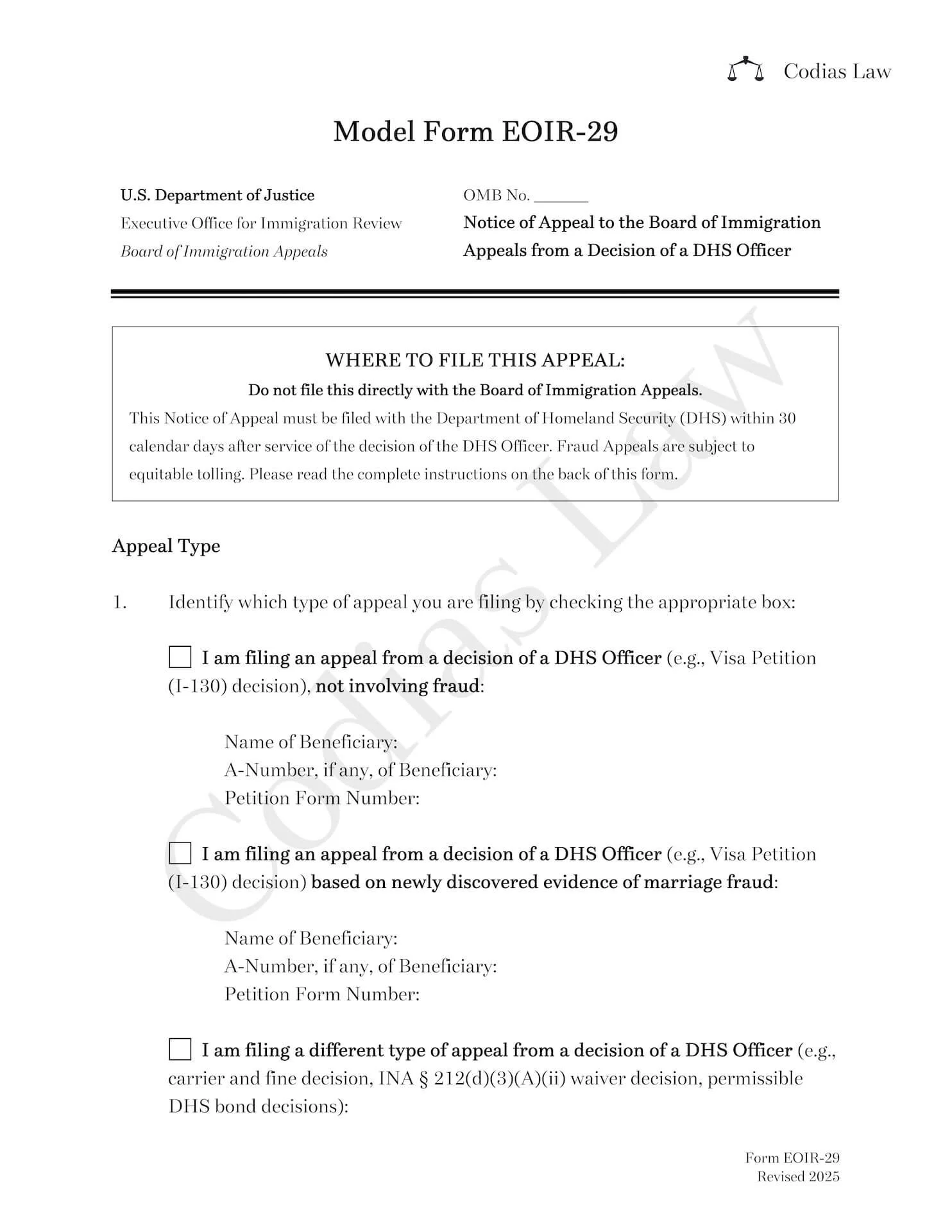 This form is used to file BIA appeals and includes updated language to ensure proper processing of fraud-based appeals.